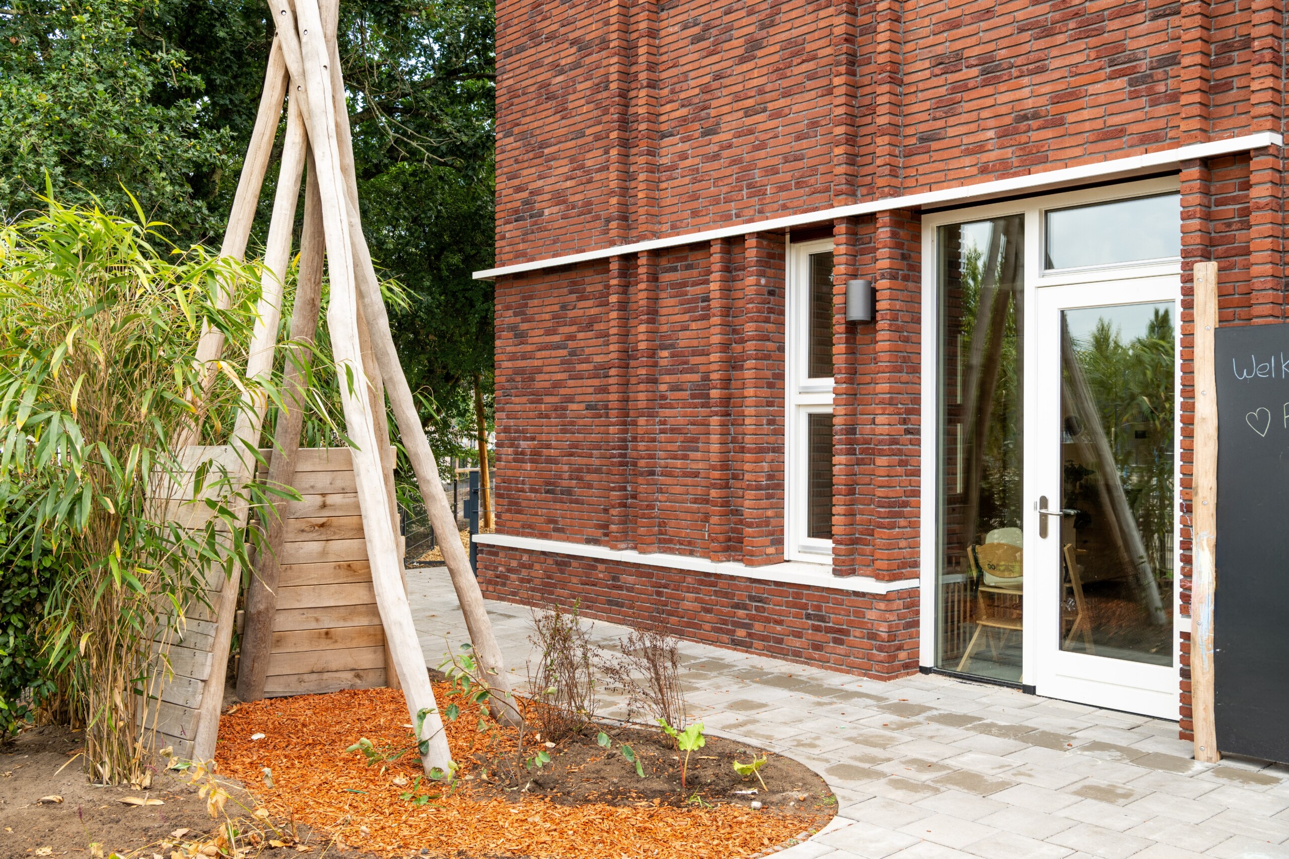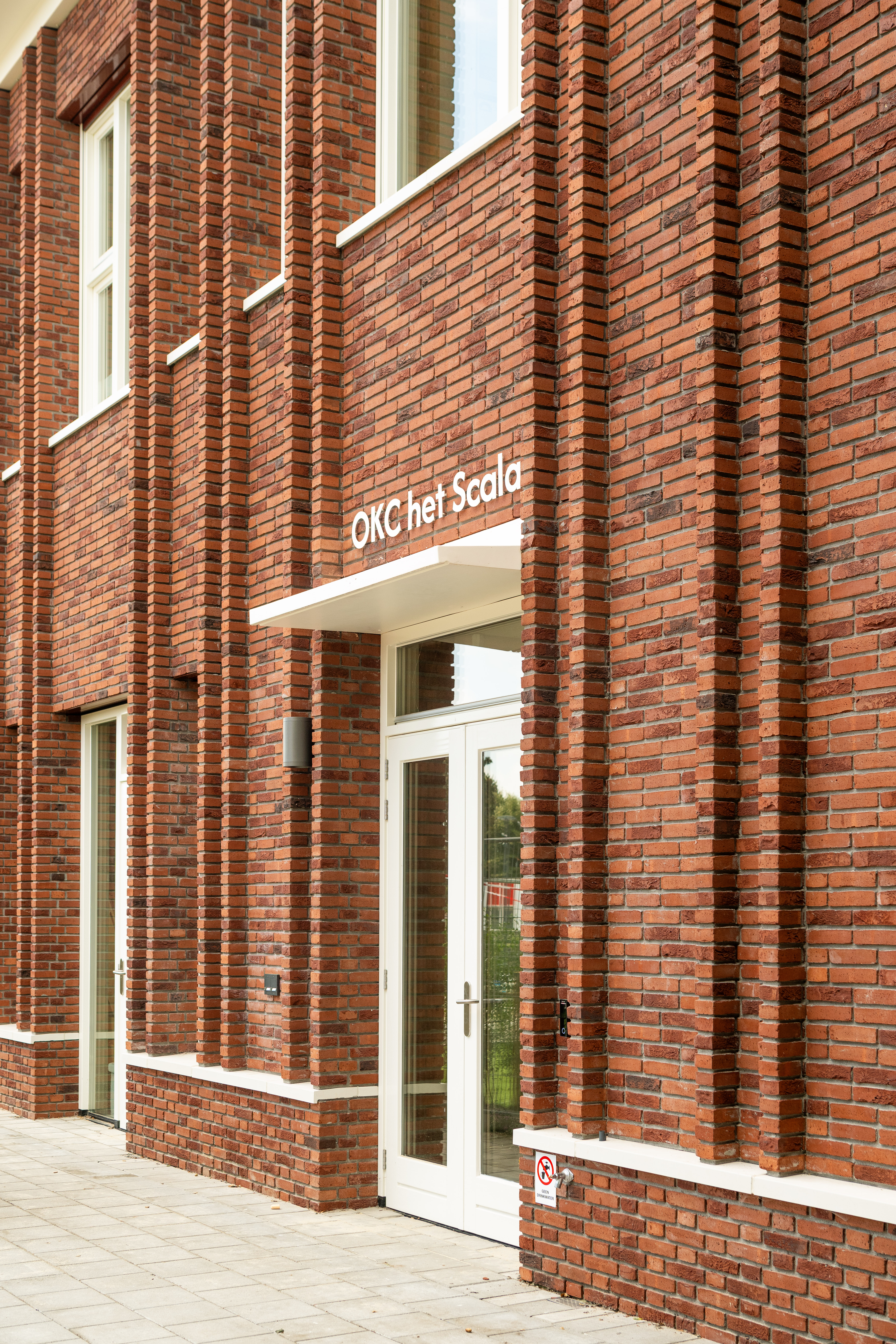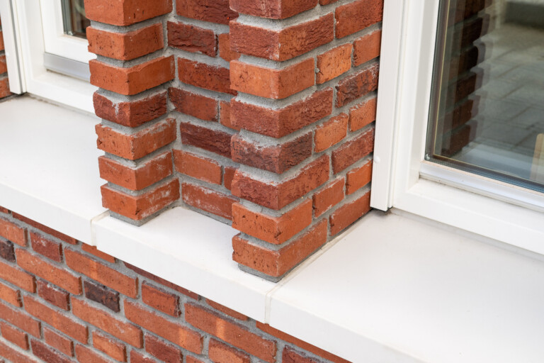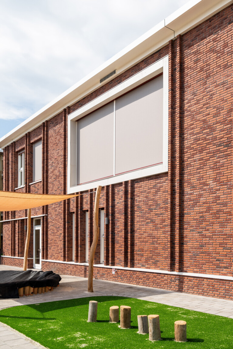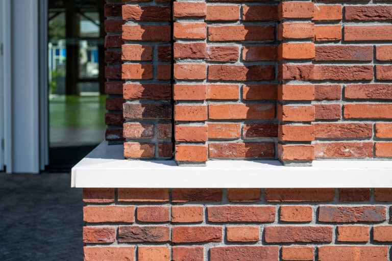 Binnen de stedenbouwkundige context -een wijk met jaren ’50-architectuur- was metselwerk een logische keuze voor de gevel. Toch werd ook hier gezocht naar maximaal haalbare duurzaamheid. Voor de witte gevelaccenten koos het team voor Holonite, een hoogwaardige kunststeen. Bas van Vliet van Holonite licht toe: ‘De architect zocht een sterk, onderhoudsarm product dat esthetisch én circulair is. Ons composietsteen bestaat voor 80% uit grondstoffen met een natuurlijke oorsprong en kan volledig worden hergebruikt. Het gladde oppervlak is niet alleen mooi, maar maakt ook schoonmaken eenvoudig.’ Holonite leverde de Type X-raamdorpels, spekbanden en kaders rondom de grote raampartijen aan de kopse kanten van het gebouw. De frisse witte belijning vormt een krachtig contrast met het metselwerk en geeft de gevel een eigentijdse uitstraling. ‘Een schoolproject vraagt om hufterproof materiaal. Het moet bestand zijn tegen leerlingen die op de raamdorpels chillen en tegen situaties zoals omvallende fietsen.’ Ook elders in het gebouw zijn innovatieve materialen toegepast, zoals biocomposiet gevelelementen en dakranden en CO2-negatieve gevelstenen voor de gymzaal, eveneens in wit uitgevoerd. In combinatie met de Holonite-elementen ontstaat een verfijnd spel van texturen en tinten.